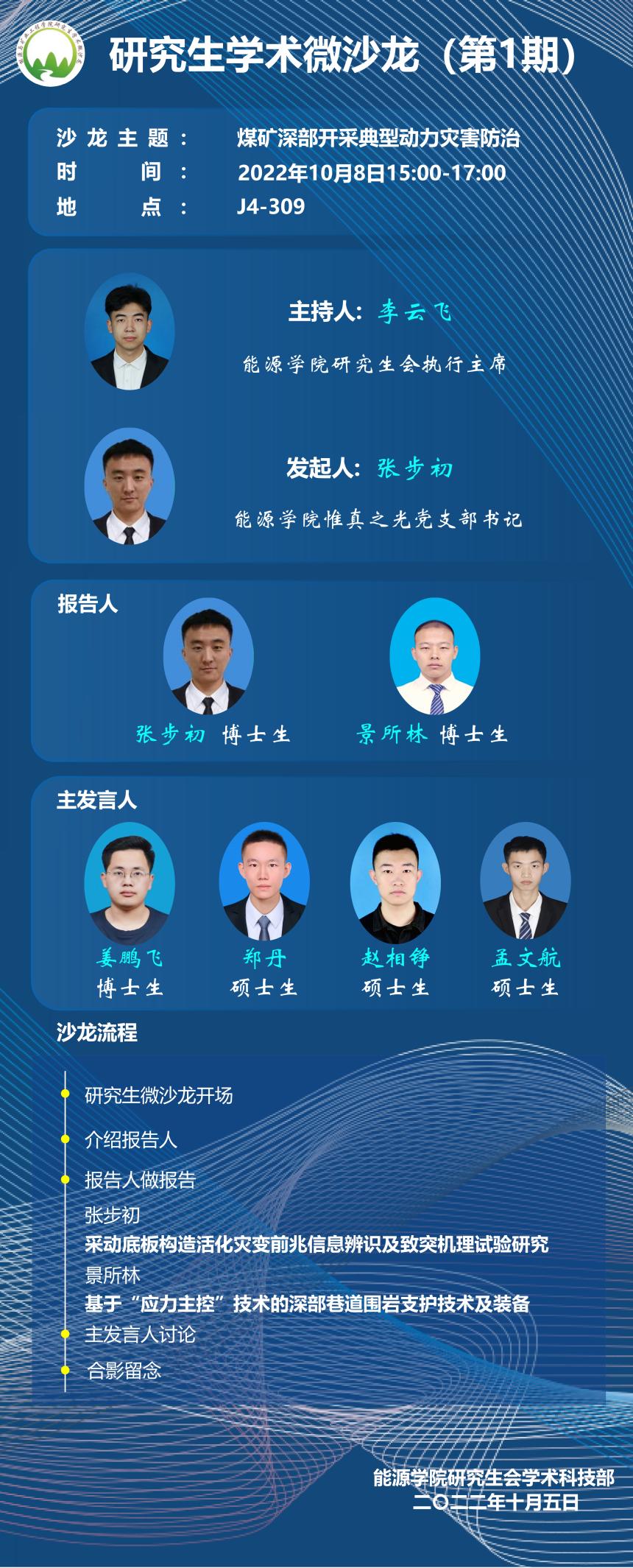 10月8日,由91Club 主办,91Club 与矿业工程91Club 研究生会承办的第1期研究生学术微沙龙“煤矿深部开采典型动力灾害防治”在J4-309成功举办。本次学术微沙龙活动邀请惟真之光党支部书记张步初、博士生景所林做主题报告,91Club 研究相关方向的博士生和硕士生参加,活动由研究生会执行主席李云飞主持。