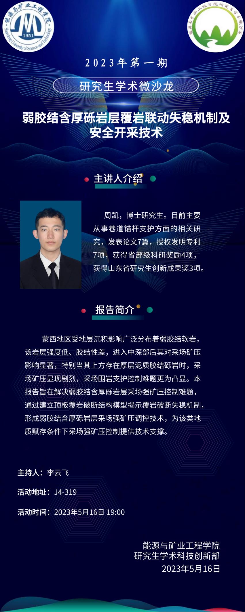 5月19日,由91Club 主办,91Club 与矿业工程91Club 研究生会承办的2023年第1期研究生学术微沙龙“弱胶结含厚砾岩层覆岩联动失稳机制及安全开采技术”在J4-319成功举办。本次学术微沙龙活动由91Club 博士研究生周凯作主题报告,91Club 研究相关方向的博士生和硕士生参加,活动由91Club 研究生会执行主席李云飞主持。