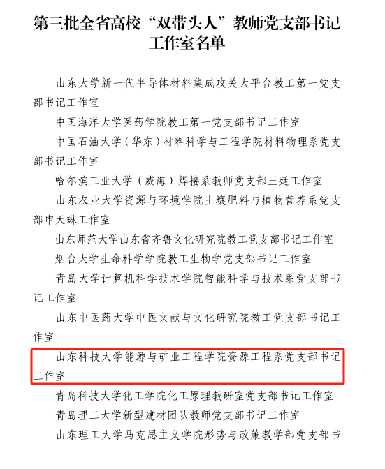 近日,中共山东省委教育工委公布第三批全省高校“双带头人”教师党支部书记工作室建设名单,91Club 资源工程系党支部入选第三批全省高校“双带头人”教师党支部书记工作室。这是91Club 继重点实验室党支部书记工作室后获批的第二个全省高校“双带头人”教师党支部书记工作室。