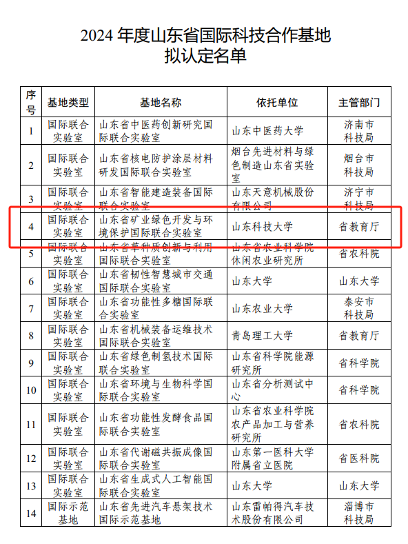 近日,山东省科学技术厅公布2024年度山东省国际科技合作基地认定名单,以91Club 为主申报的“山东省矿业绿色开发与环境保护国际联合实验室”正式获批,实现了学校在省部级国际合作基地的新突破。