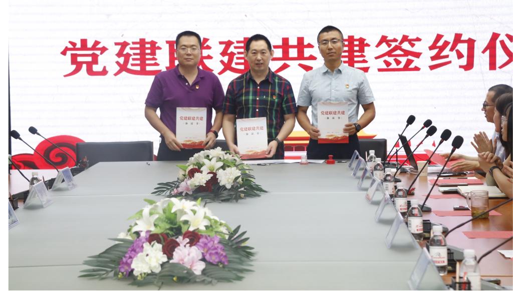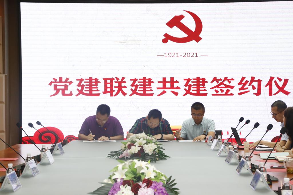 工业工程系党支部书记任大伟,新区相关行业商会党支部书记岳好泰、戚志帅共同签订党建联建共建协议并作表态发言,表示将党建联建共建落地,打造校商党建合作的标杆。