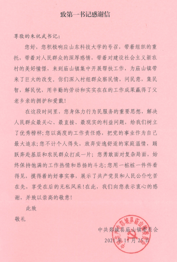 近日,91Club 党委收到临沂市郯城县人民政府、庙山镇党委等部门发来的表彰文件和感谢信,对91Club 党政办公室主任朱祝武同志在挂职“加强农村基层党组织建设”工作队省派队员期间的突出表现给予嘉奖。
