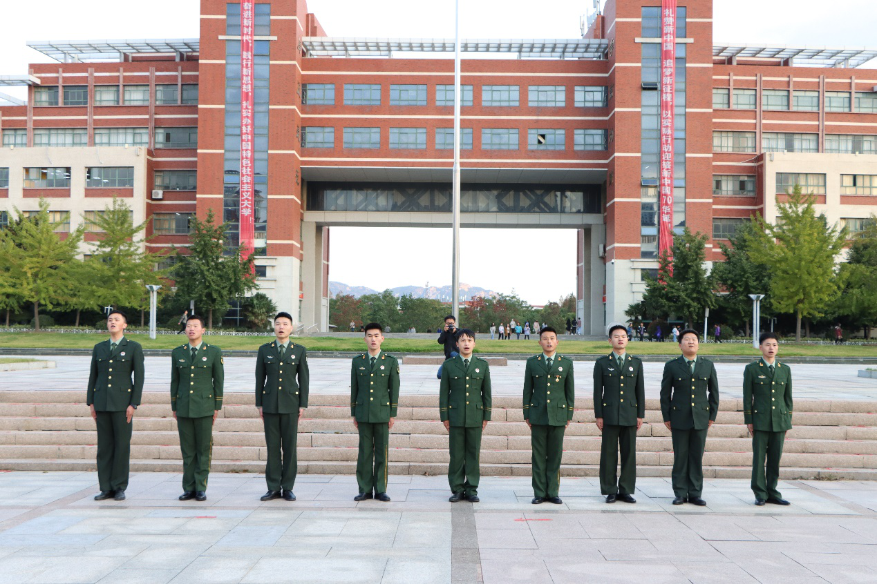 国旗护卫队昂首挺胸、气宇轩昂,《义勇军进行曲》响彻泰山广场,国旗手振臂一挥,鲜艳的五星红旗在科大上空迎风飘扬。