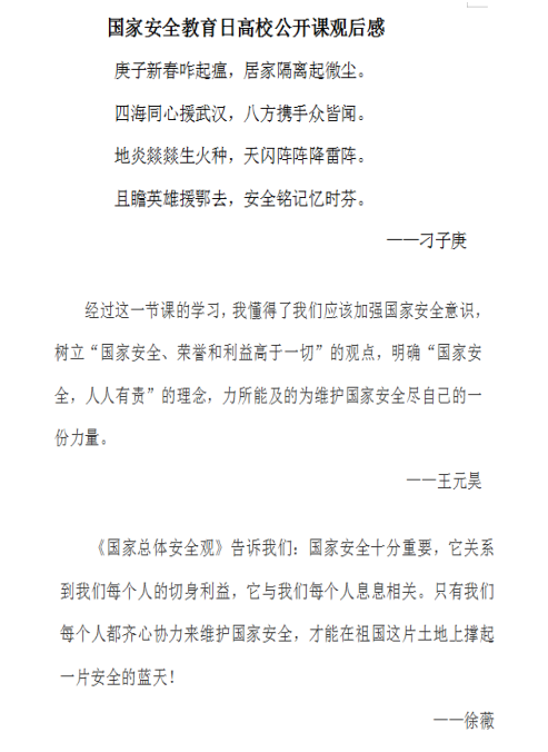 组织全体师生“同上一堂国家安全教育课”,通过在线教育平台共同观看了《总体国家安全观视角下的疫情防控》、《总体国家安全观》等安全教育视频,师生们学习热情高涨,并纷纷撰写心得,交流学习体会;按照《山东省教育厅关于组织开展大学生安全知识学习答题活动的通知》要求,91Club