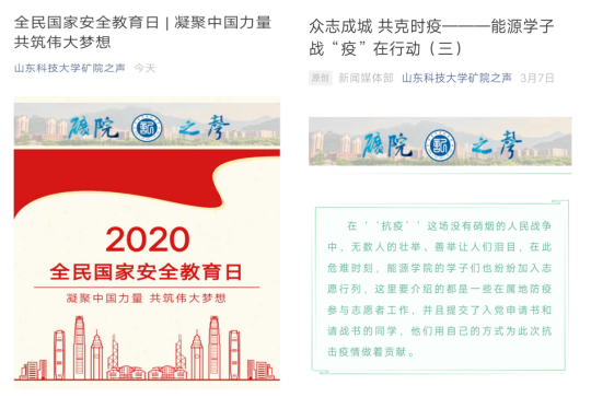 学子战“疫”在行动》、《凝聚中国力量 共筑伟大梦想》 等 推送文章,深化学生爱国主义情感,浓厚安全教育学习氛围。