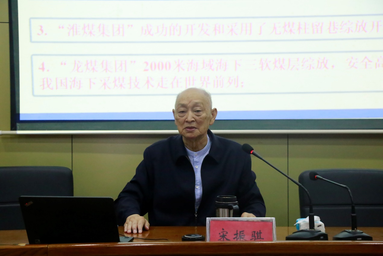宋振骐从采矿工程学科发展战略研究和创新驱动与智能制造两方面入手向研究生们介绍了采矿工程在中国国民经济战略中所占的地位、对中国经济发展的巨大贡献、现今煤炭开采所遇到的一些问题以及今后采矿工程的发展方向与趋势。宋振骐讲述了自己最近几年所做的项目,并表示自己虽已是耄耋之年,但仍然要奋斗在生产的第一线,不忘初心,始终如一。宋振骐着重强调“创新”一词,并说道:创新突破的难点是地下开采的信息化,智能化,可视化,没有创新就没有进步,而创新需要高质量人才,这是当代青年们所面临的巨大挑战和机遇。最后,宋振骐勉励同学们在学习理论知识的同时要不忘初心,牢记使命,顺应时代潮流,大胆创新,砥砺向前!