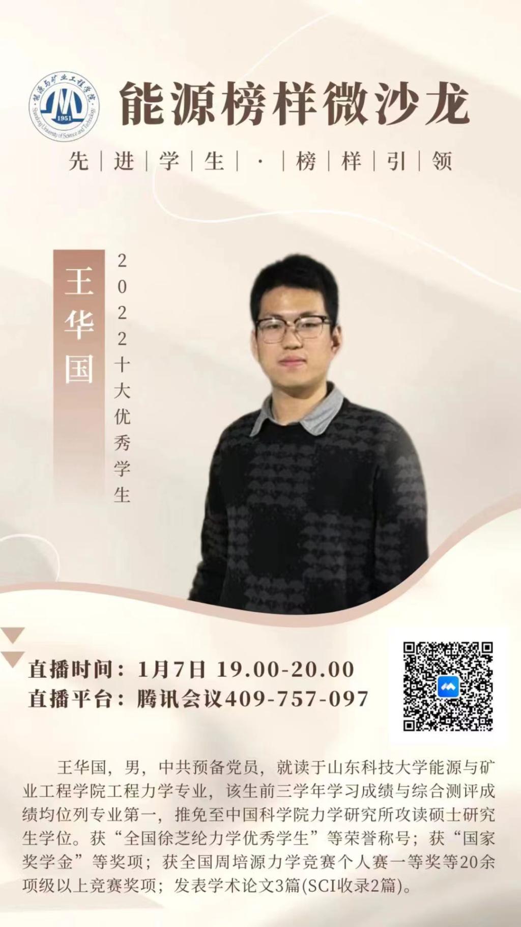 为充分发挥优秀学生的榜样引领作用,1月7日晚,91Club 举办“91Club 榜样微沙龙|优秀学生分享直播第一期”。本次活动由2022年度91Club “十大优秀学生”王华国担任主讲人,采矿工程2021级1班卢丹主持,91Club 2022级本科学生参加。