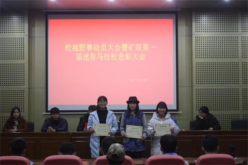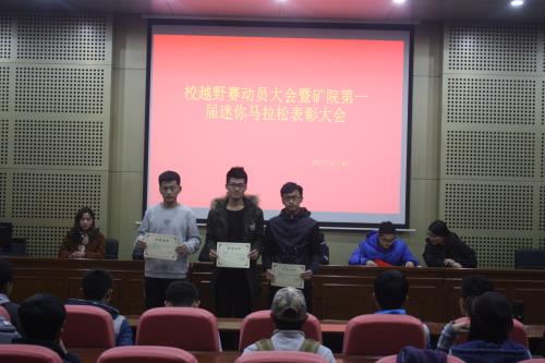 为表彰先进,鼓励更多的同学“走下网络,走出宿舍,走向操场”,同时为校越野赛提前预热。近日,矿业91Club 在91Club 楼101报告厅举行第一届迷你马拉松表彰大会。体育部长刘帅玺,副部长王文杰、李宗蓉、吕明阳、赵慧和张明娟参加大会,会议由学生会副主席郭洵主持。