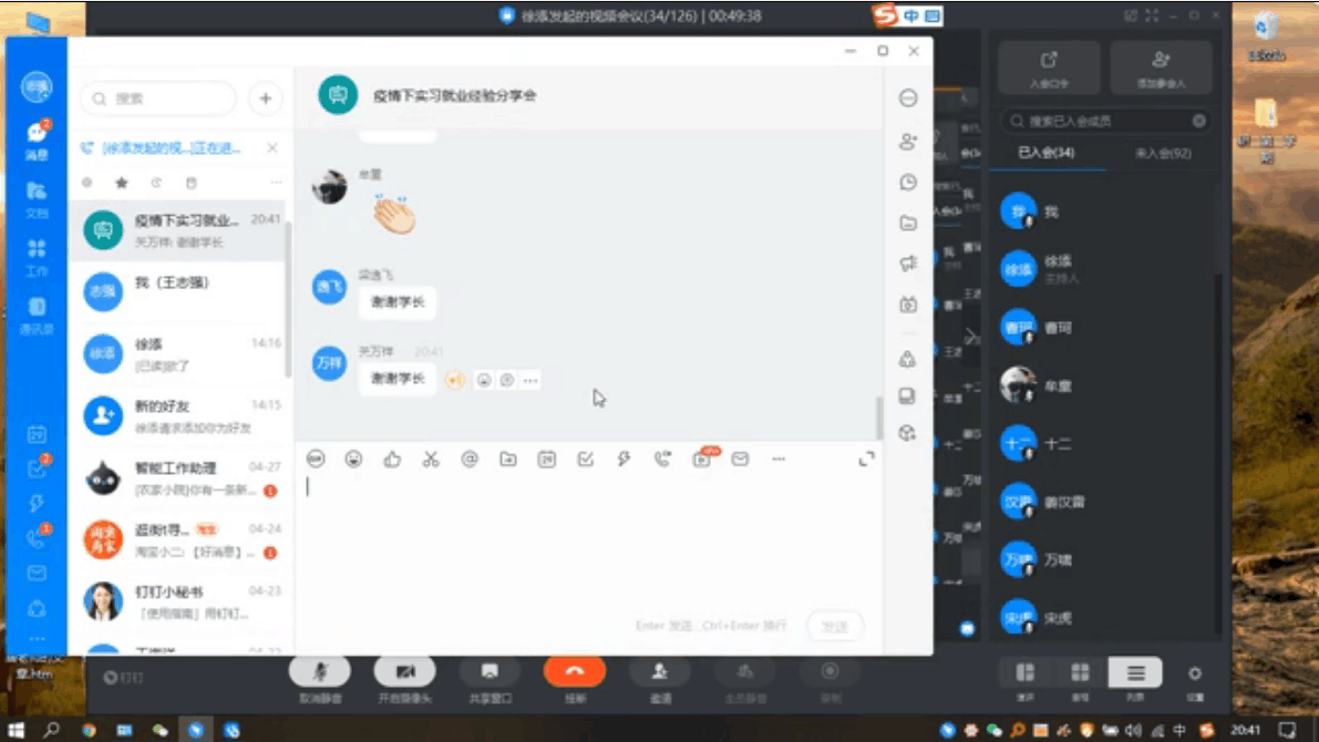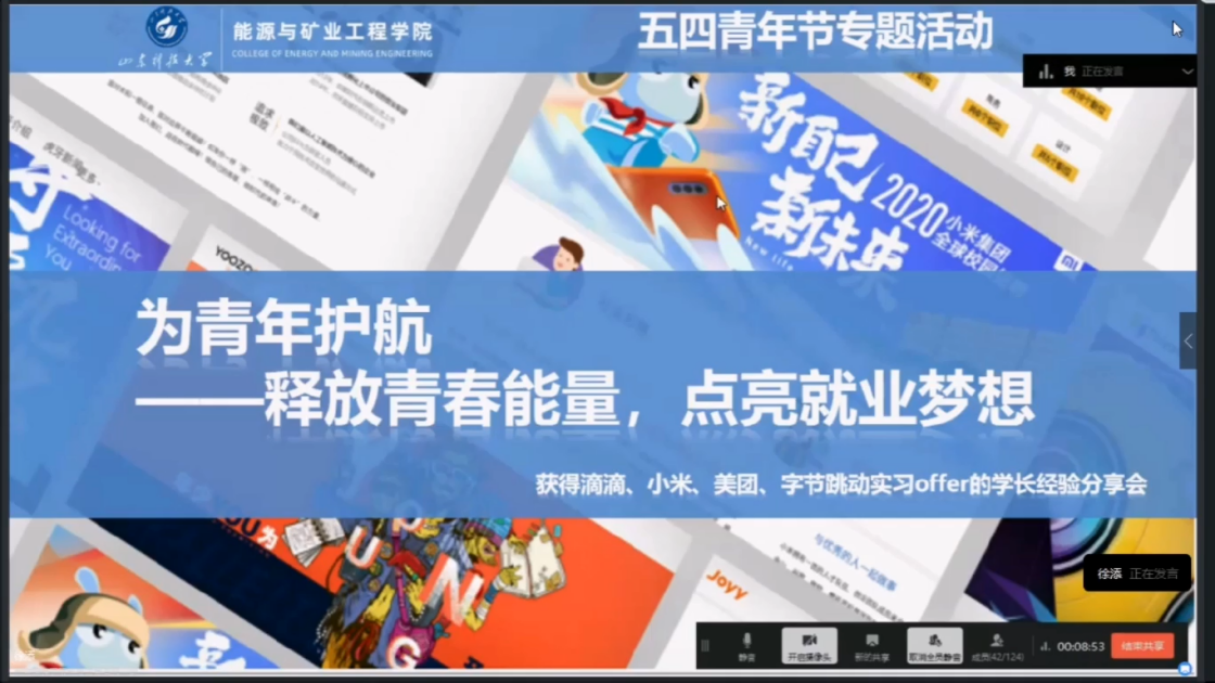 利用腾讯会议平台开展五四专题:为青年护航——释放青春能量,点亮就业梦想分享会。硕研18-2班研究生徐添担任主讲人,91Club