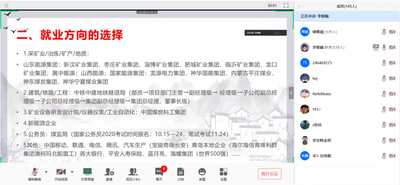 利用腾讯会议平台举办了三期线上就业经验交流会, 2016 级毕业生李智峰、张惠和赵立章为同学们分享了就业经验。