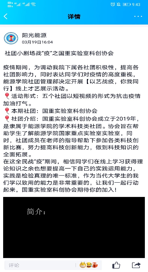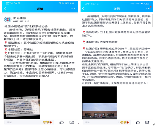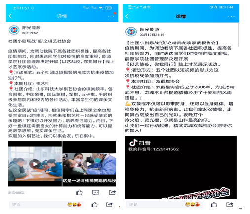 各社团通过短视频的形式,向同学们介绍社团发展、宣扬社团文化,让学生了解社团、走进社团并感受社团的特色。其中行乐社通过乐器表演,展现出同学们积极向上的精神风貌;大学生思辨社回顾以往辩论场上的精彩瞬间,让同学们仿佛置身于那唇枪舌剑的语言交锋中;棋艺社展示了各种棋类的比赛视频,严肃认真的棋手让同学们身临“棋”境;精武龙魂双截棍协会通过抖音短视频的形式,将威武霸气的双截棍与可爱呆萌的卡通人物结合,吸引了诸多同学的目光;国重实验室科创协会介绍了91Club
