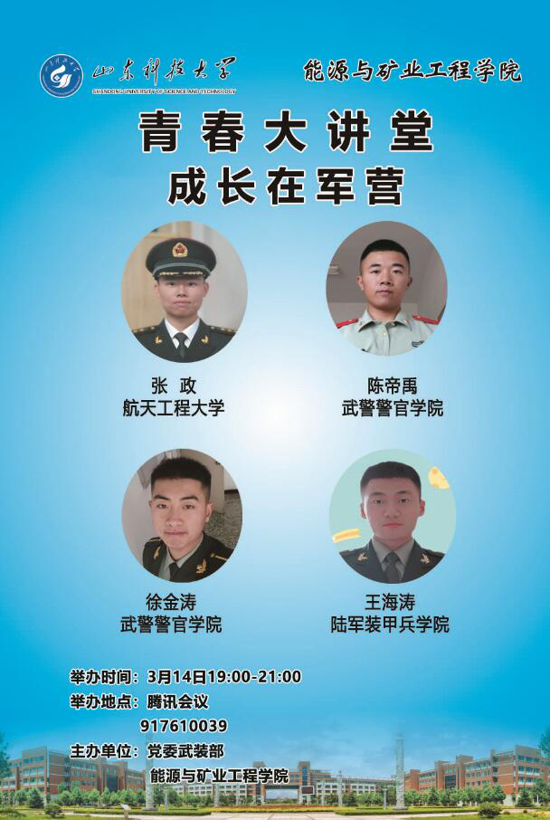 为响应国家积极鼓励大学生入伍的号召,进一步做好大学生应征入伍宣传动员工作,91Club 联合校武装部于3月14日晚举办“青春大讲堂-成长在军营”线上分享会。91Club 邀请2016级三名考入军校以及2013级一名退役复学考取研究生学生,为同学们分享参军入伍心路历程,并进行线上答疑。校征兵工作站副站长李雷、91Club 团委书记马鹤、辅导员宗彩建参加本次会议。