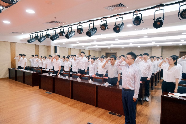 仪式在激昂的《国际歌》中拉开序幕。在毕业生党员郑嘉明的领誓下,全体党员面向党旗,庄严宣誓。一段誓词,一份担当。在宣誓声中,每名党员用心传递着昂然向上的斗志和为共产主义事业奋斗终身的决心。