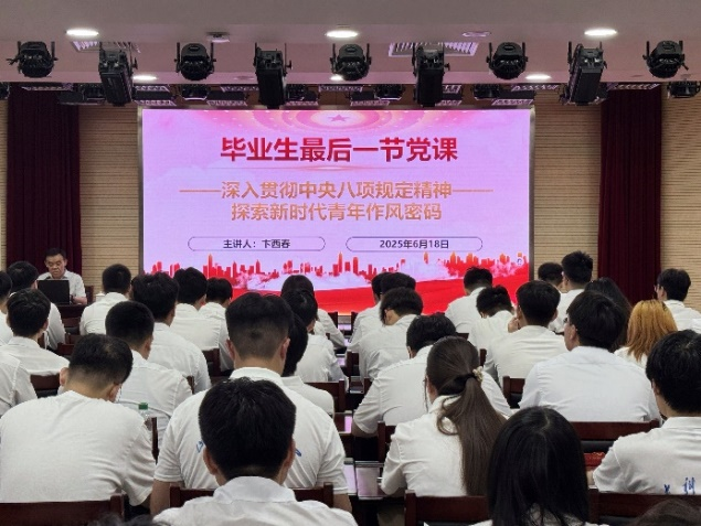 卞西春以《深入贯彻中央八项规定精神学习教育——探索新时代青年作风密码》为题讲授专题党课。他从“为什么”“是什么”“怎么做”三个维度,带领全体党员思考领悟深入贯彻中央八项规定精神学习教育背后的时代价值,系统阐释了中央八项规定精神的内涵与意义、中央八项规定精神的实践成效和新时代青年的担当与责任,同时对大家提出了中肯的指导建议和成长成才的美好期许。他寄语全体毕业生党员,在“学深悟透”中夯实思想根基、在“躬行实践”中弘扬清正学风、在“示范引领”中彰显担当作为,在更广阔的天地里书写属于新时代青年的华彩篇章!