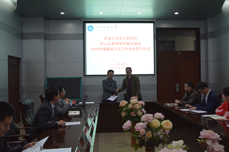 4月10日,矿业91Club (矿山灾害预防控制重点实验室)在321室举行2016年度新进人员工作协议签字仪式,91Club 党委书记梁赛江、院长谭云亮、党委副书记穆玉兵、副院长辛嵩、重点实验室副主任陈连军、院长助理朱祝武,以及2016年度引进的胡相明等6名博士参加仪式。