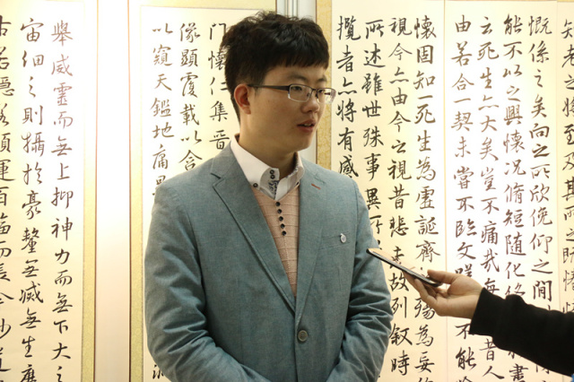 的基本情况,李克周对刘言哲毕业书画展的成功开展表示祝贺,希望通过本次展览进一步激发同学们对书法的浓厚兴趣,籍此传播弘扬传统文化,活跃和繁荣校园文化。宋合成对刘言哲取得的成绩表示祝贺,并指出刘言哲在这样的年纪取得这样的成绩实属不易,背后一定经历了艰辛的付出,是当代大学生的榜样,希望他的书法之路越走越远,越走越顺畅。刘言哲书法导师潘月孝讲述了刘言哲艰辛的书法之路,对爱徒取得的成绩表示肯定,希望他能在书法道路开辟自己的新天地。