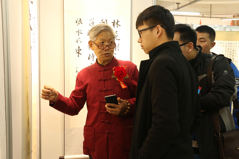 开幕式结束后,嘉宾和同学们进入展厅参观,展品共108幅(含老师书友作品20幅),主要涉及楷书、隶书、行书、草书四种书体,涵盖了立轴、横批、长卷、扇面等形式,作品字字遒劲有力,入木三分,笔画龙飞凤舞,锋芒毕露。嘉宾们在现场挥毫泼墨,执笔题字为刘言哲同学表示祝贺。潘月孝老先生的一幅《海纳百川》,提笔凝神,下笔有力,展现一名老艺术家的深厚功底;梁赛江笔走龙蛇,潇洒飘逸地完成一幅《物华天宝》。
