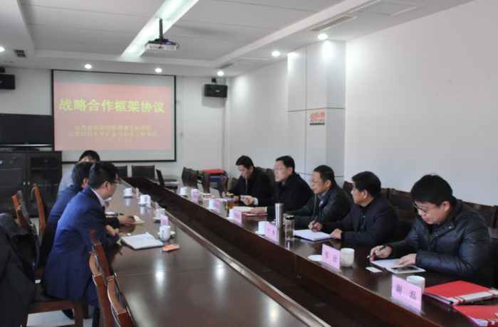 于付国对矿业学院一行的到来表示热烈的欢迎,并介绍了五队的基本情况和在地球物理探测、页岩气开发等领域的研究情况。谭云亮对山东省煤田地质局第五勘探队的热情接待表示感谢介绍了学院的发展历史、学科建设等方面的基本情况,并就矿业安全探测新技术的应用、大数据智能化开采等前沿技术做了详细讲解。