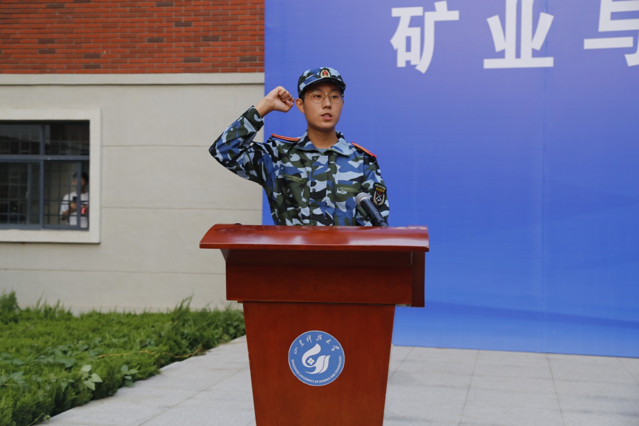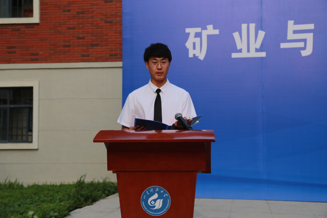 2019 级新生代表付澔天代表新生向学院老师、迎新工作人员表示感谢,他带领2019级全体新生集体宣誓:“高举社会主义伟大旗帜,秉承‘惟真求新,自强不息’院训精神;爱国励志,坚定信念;遵纪守法,诚实守信;勤学笃信,自强不息……”字字铿锵,句句有力,彰显出矿院学子勇于拼搏、敢于进取的决心和信心。