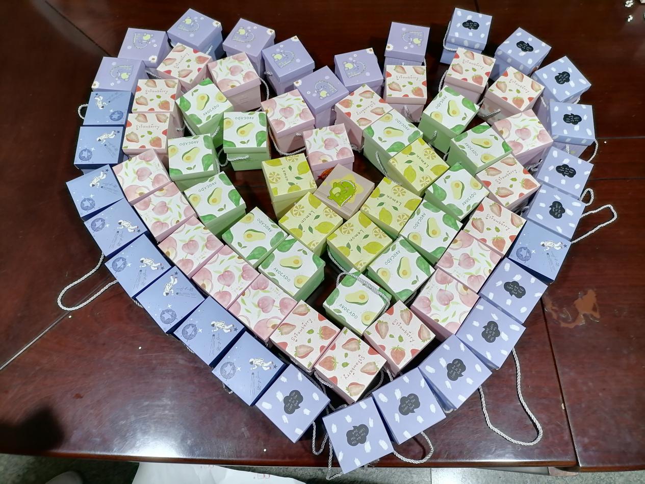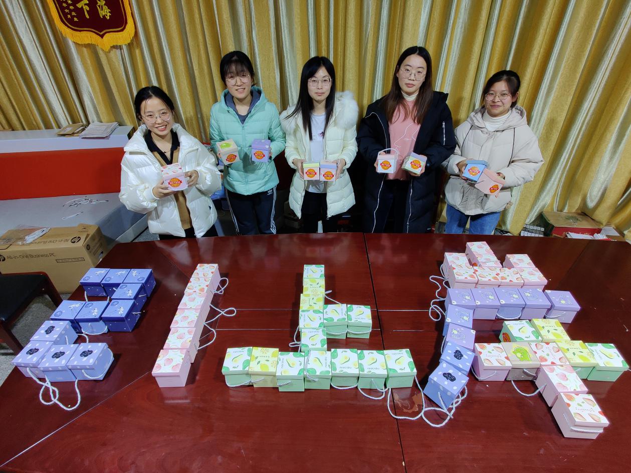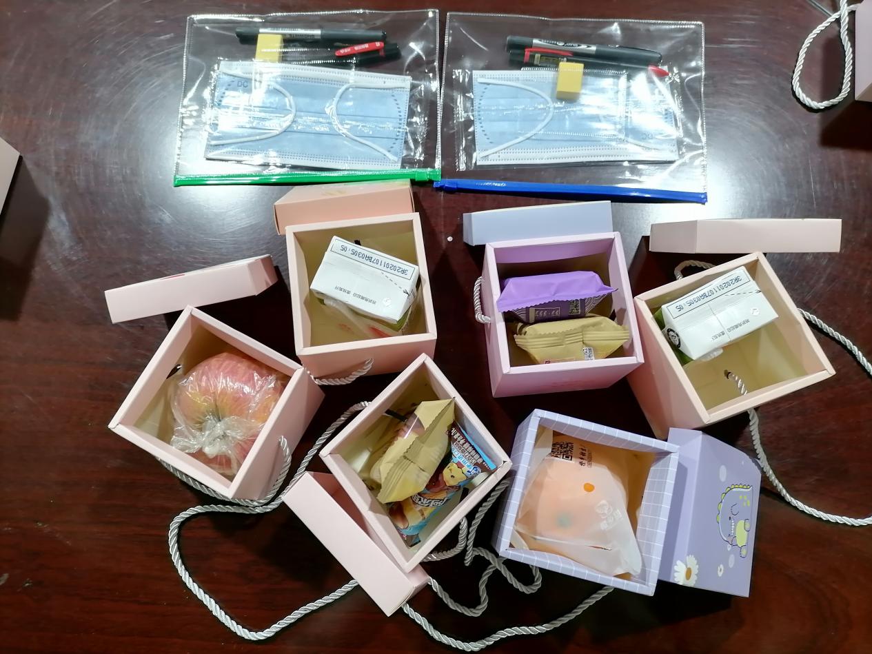 考研幸运礼包包含考研祝福福盒和“沿途有你”考研加油包,学院在礼包中精心准备了糖心苹果、赣南脐橙、糕点、牛奶、棒棒糖和考研专用笔袋,每一份礼物都不尽相同,爱意满满。祝福福盒分为心想事“橙”盒、及第“糕”中盒、牛”气冲天盒、开花结“果”盒、考试倍“棒”盒,供同学们随机抽取;“沿途有你”考研加油包装有考试专用涂卡笔、中性笔、橡皮等考试用品,且考虑到疫情的影响,学院在加油包中特别准备了具有独立包装的口罩,提醒同学们提高安全意识,做好防护。