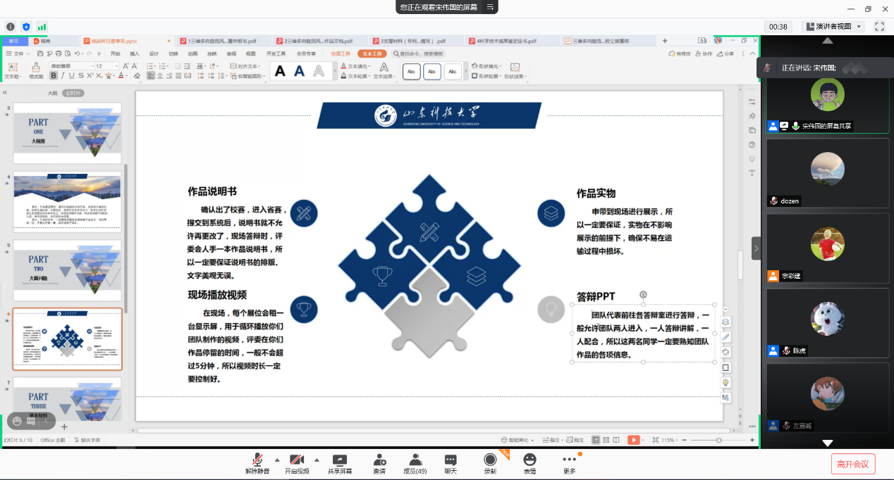 宋伟国讲述获得“挑战杯”全国大学生课外学术科技作品竞赛奖项的经验及应该准备的材料,详细阐述不同的参赛类别应注意的事项,从成员架构到材料撰写到后期优化,一一提出自己的建议。