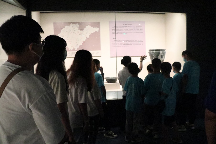 最后,经过与中铁建工志愿者交流后,队员们来到黄河文化沉浸式交互中心进行志愿宣讲,他们将自己在山东博物馆的所见所感倾诉于孩子们,绘声绘色地讲述着黄河的故事,并跟随中铁建工的志愿者们一同为孩子们讲解博物馆内的文物,宣传黄河流域史前文明代表性珍贵文物,展现黄河流域从一万年文化史到五千年文明史的演进历程,让孩子们更好的认识中华文明的起源、形成、发展的历史脉络。