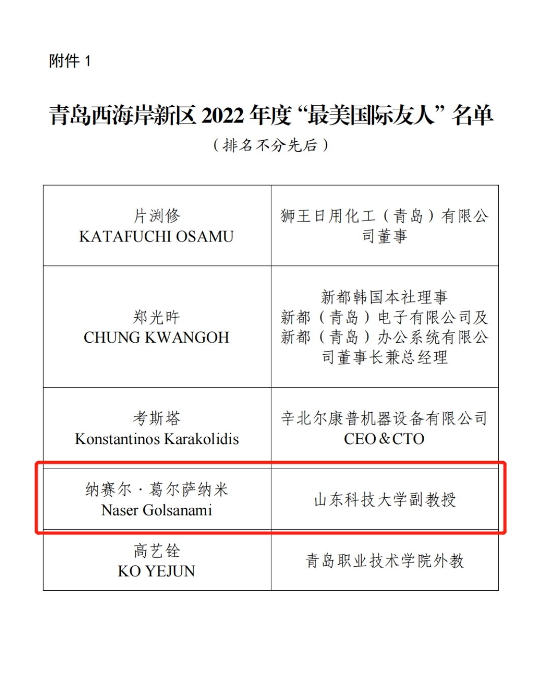 2月10日,中共青岛西海岸新区工委宣传部和青岛西海岸新区外事服务中心公布了关于青岛西海岸新区2022年度“最美国际友人”、“最美外事工作者”的通报。经过广泛宣传发动、优秀典型推荐、综合评价等评选程序,通过征求公安等有关部门意见,并公示无异议后,91Club 纳赛尔副教授荣获青岛西海岸新区2022年度“最美国际友人”荣誉称号。