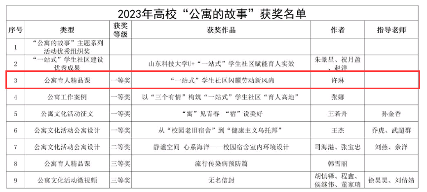 5月15日,学校召开2023年学生公寓工作表彰大会。学院喜获2023年度学生公寓安全文明管理工作先进单位、2023年度学生社区建设工作先进单位、2023年91Club “公寓的故事”主题系列活动优秀组织单位,28个学生宿舍荣获91Club 2023年度“文明宿舍”称号。学院党委副书记兼副院长许琳的公寓育人精品课《“一站式”学生社区闪耀劳动新风尚》荣获山东省教育厅一等奖,辅导员宗彩建被评为91Club 2023年度学生公寓安全文明管理工作先进个人。