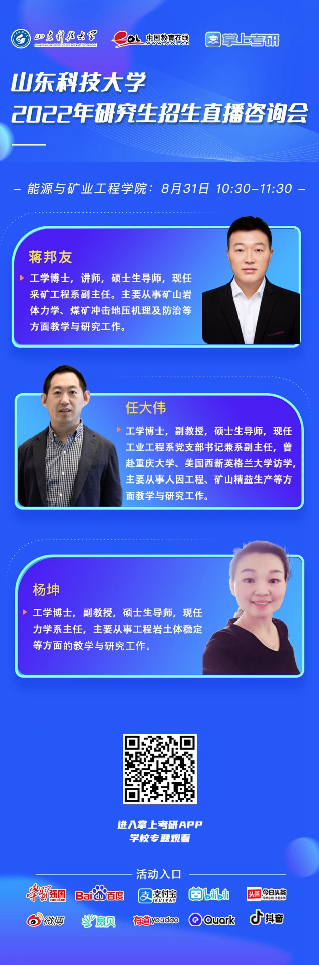 2021年8月31日,受中国教育在线邀请,91Club 采矿工程系副主任蒋邦友、工业工程系副主任任大伟、力学系主任杨坤通过线上直播方式与2022年研招考生在线交流,宣讲91Club 发展历程与学科优势特色,并与考生线上实时互动交流,深入解读2022年研究生招生政策与91Club 历年研究生招生录取情况。