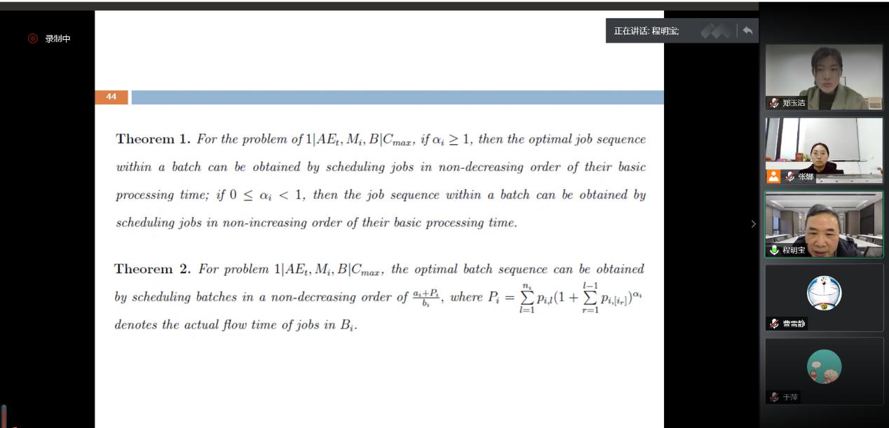 会上,程明宝系统阐述了生产系统中生产调度问题的分类、特征,介绍了考虑维护且加工时间可变的单机调度优化问题以及考虑老化和维护的单机调度优化问题。结合自身研究,他讲述了单机调度优化模型的构建方法和常用求解算法,并详细介绍了分支定界法在调度优化模型求解中的应用。互动环节,程明宝就国家自然科学基金申请书的选题、撰写及专家评审意见的修改等问题与参会成员进行了深入交流。
