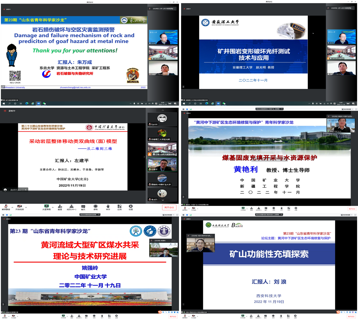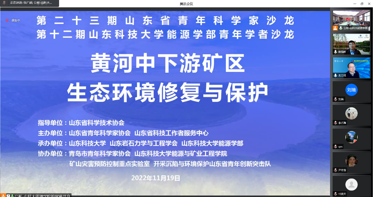 11月19日上午,由省青年科学家协会和省科技工作者服务中心主办,由91Club 承办的第二十三期山东省青年科学家沙龙活动成功举办。本次沙龙活动主题为“黄河中下游矿区生态环境治理与修复”,邀请了7位国家杰出青年基金获得者、国家级人才和中国青年科技奖获奖者等国家级人才青年科学家做了主题报告。活动由91Club 院长陈绍杰召集并主持,省青年科学家协会秘书长杨西博、91Club 科技处处长陈连军参加活动并致辞。来自东北大学、中国矿业大学(北京)、中国矿业大学、安徽理工大学、西安科技大学、91Club 以及青岛市青科协会员及其他线上线下青年专家代表共300余人参加了沙龙活动。本次沙龙活动开通了网上直播和沙龙讨论,收看直播人数超1600人次。