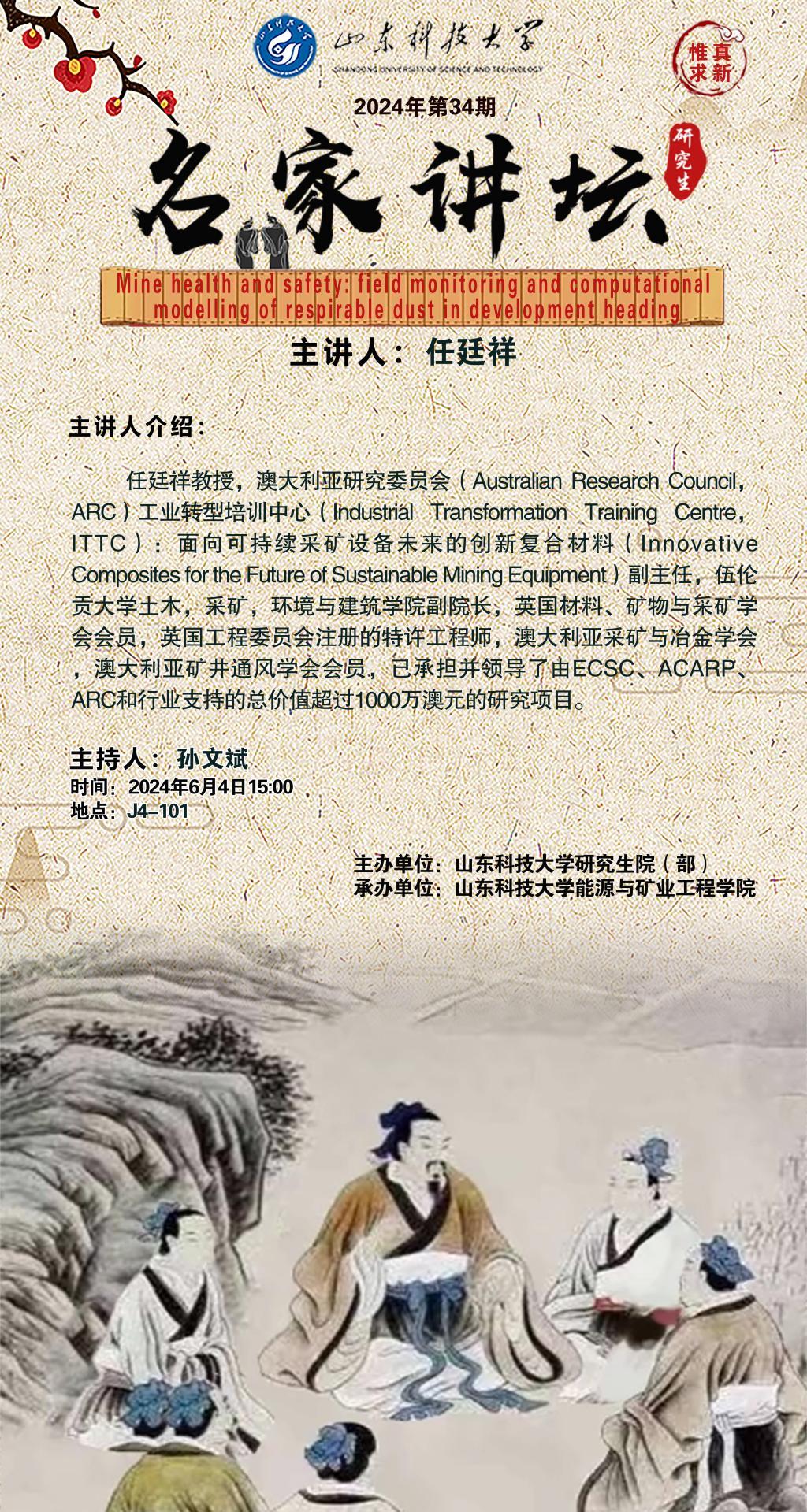“名家讲坛”2024年第34期:Mine health and safety: field monitoring and computational modelling of respirable dust in development heading