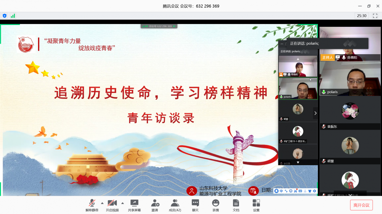 为弘扬五四精神,树立榜样的力量,5月4日青年节,91Club 利用线上平台举办“追溯历史使命,学习榜样精神”青年访谈活动。本次活动邀请了91Club 与矿业工程91Club 资源工程系老师陈军涛担任主讲嘉宾,91Club 学生会主要学生干部以及2019级 全体 团支书参与此次活动。
