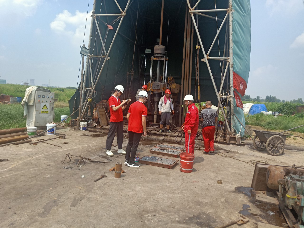 正值酷暑,但难以抵挡队员们求知的热情。一到莒县,队员们就带着强烈的好奇心直奔一线施工现场。远远望去,只见一高塔状的机器矗立在平坦的草地上格外显眼,据工作人员介绍说,队员们看到的就是位于钻探井场的钻机,是地热勘探工程的主力军。