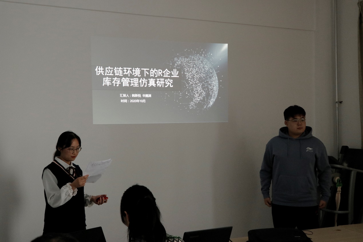 答辩过程中,参赛队伍依次向专家评委展示自己的作品,对作品选题、研究方法、效益效果和创新点进行演示与讲解。评委老师现场打分,并就进一步完善设计方案提出了指导性意见和建议。经过严格评审,韩新悦团队的“供应链环境下R企业库存管理仿真分析”获本科组第一名,胡斐团队的“基于精益生产的Z矿采媒工艺优化研究”获研究生组第一名。
