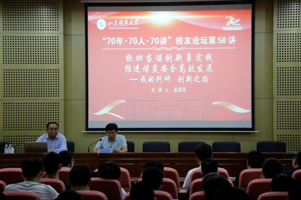 会见结束后,孟祥军为同学们作题为“敢担当谋创新勇实践,推进煤炭安全高效发展——我的科研 创新之路”的“70年·70人·70讲”校友论坛。他以自身经历为主线,从四十年煤炭人生路的角度出发,围绕“个人发展历程”“煤炭形势与机遇”“未来创新发展方向”三个方面展开讲述。结合自身经历,讲述了自己的坎坷求学路,如何一步步走上煤炭之路,并分享了从业四十年来所经历的大断面沿空巷道围岩控制、煤矿重大灾害治理、冲击地压与矿震、高端装备制造、智能开采等技术变革,同时分析了“碳达峰”“碳中和”背景下,我国煤炭形势及存在机遇。最后寄语全体同学:一定要不负众望,努力奋斗,矢志成为国家栋梁之才。