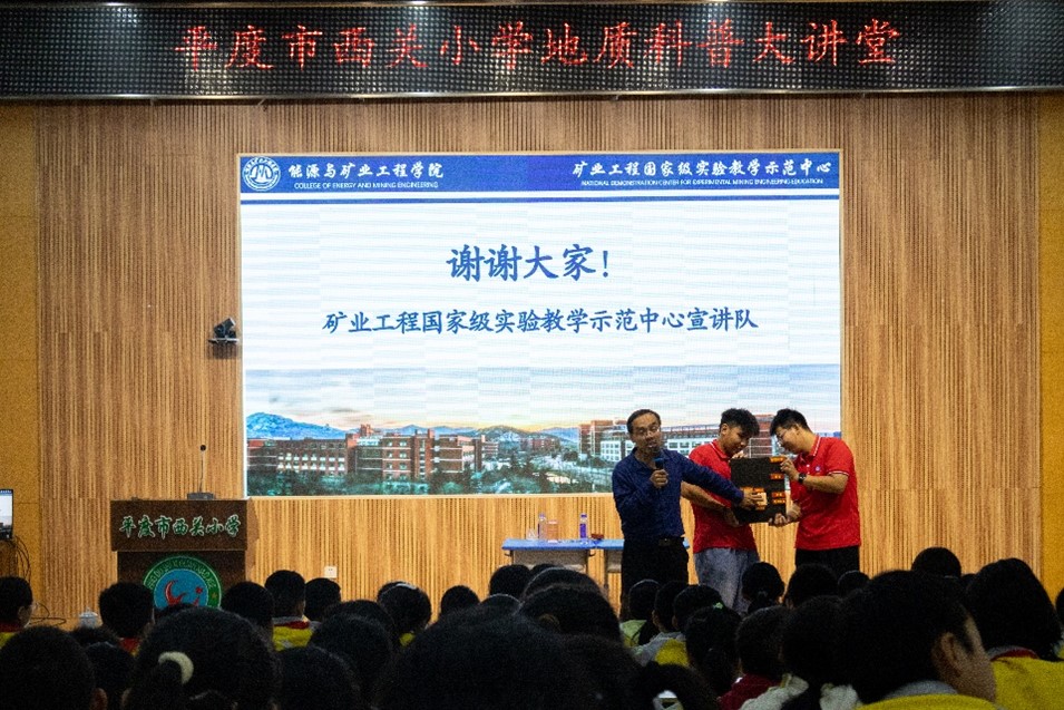 资源的神奇之处。随后,宣讲队的王呈宇和徐子豪以宋院士的科研故事为蓝本,通过互动讲述的方式,激发了同学们对科学研究的浓厚兴趣和崇高敬意。在实验环节,队员孙嘉伟精心设计了趣味实验,分批次让全部同学们有序亲身体验科学的魅力。陈老师还在实验后对煤矿巷道模型进行了详细讲解,让同学们对煤矿开采过程有了更直观的认识。