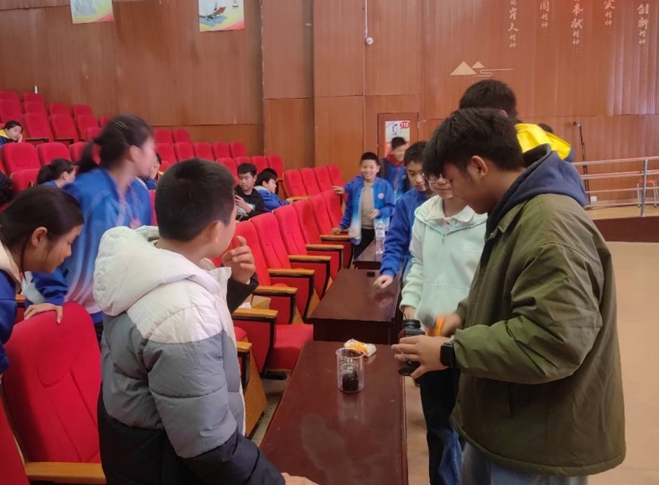 下午3时20分,宣讲队员抵达了青岛第二十六中学,该校学生热情迎接了宣讲队的到来。活动伊始,宣讲队成员谢明阳就宋振骐院士的卓越功绩、科研历程及其奉献精神展开了细致入微的科普讲解。院士的伟大事迹深深触动了在场的青年学子,他们望向宣讲台的目光中满是对科研事业的尊崇与敬仰。随后的实验环节中,队员徐子豪展示了精心筹备的两个实验项目——牛奶与高锰酸钾氧化变色实验以及连通器实验,并邀请同学们近距离观察实验现象。同学们踊跃参与,在亲身体验中感受科学的独特魅力,探索精神与对科学的热爱也由此得以进一步激发。