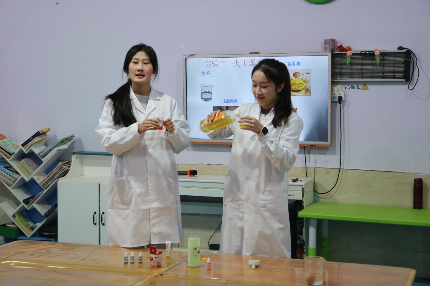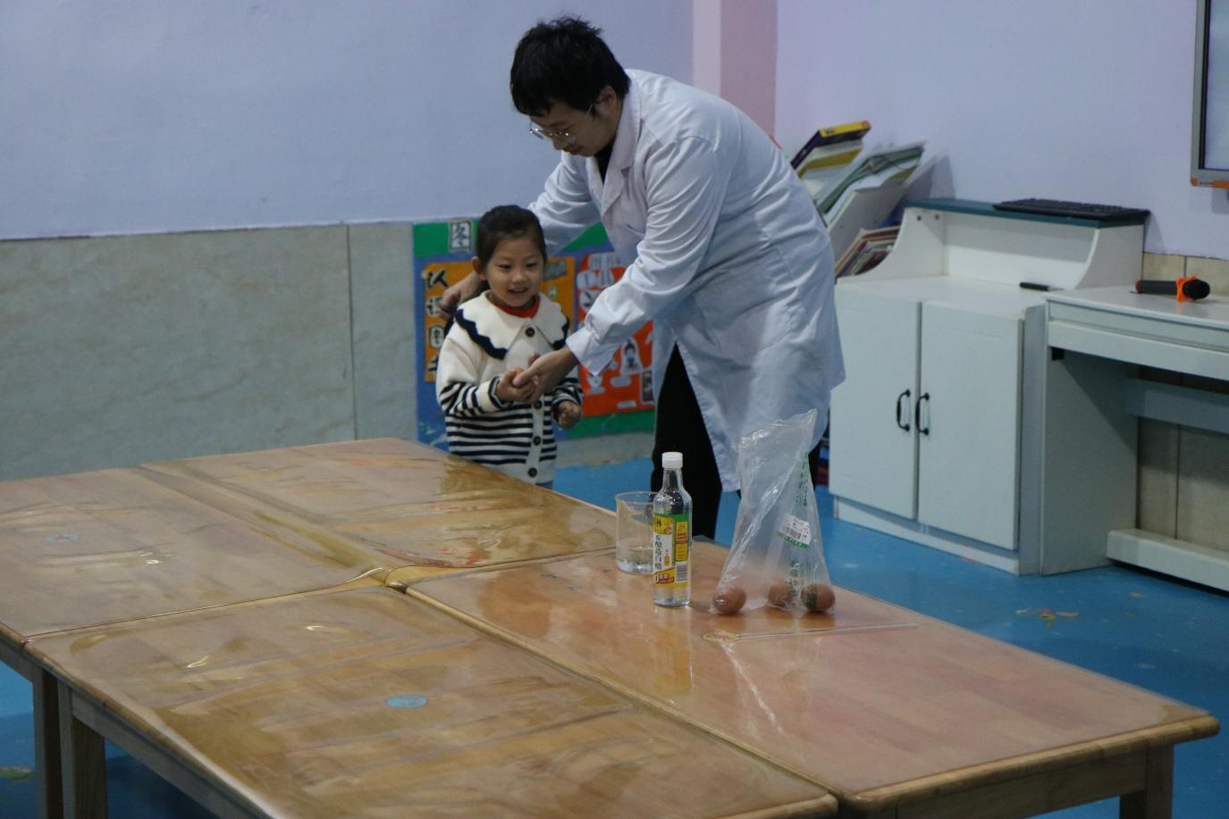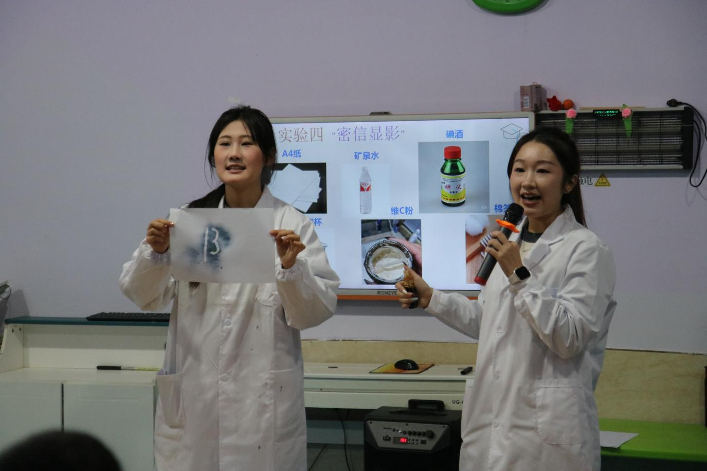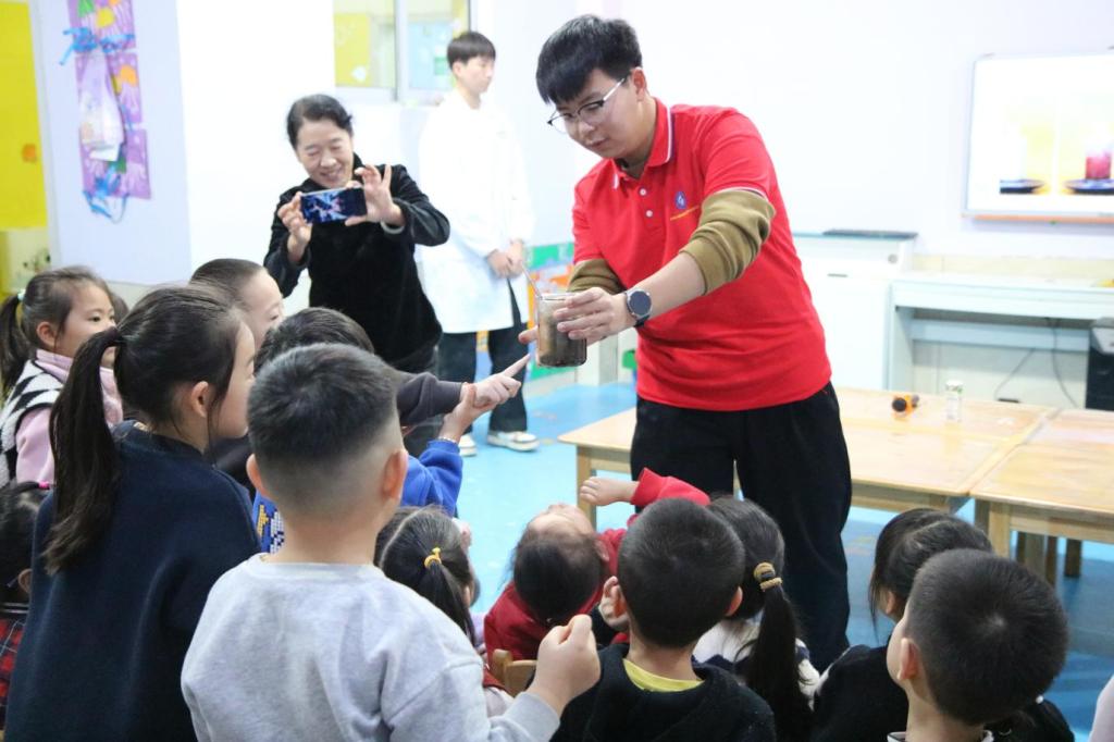 最后便是此次活动的重头戏:趣味小实验。“鸡蛋‘冒泡泡’”中,白醋与鸡蛋相遇,鸡蛋好似被施了魔法,在溶液里“吐泡泡”,小朋友们凑近观察,小嘴嘟囔着好奇追问;“火山爆发”震撼上演,纯净水与食用油在色素颜色下明显分层,加入泡腾片后,喷发时刻全场沸腾,惊叹声响彻教室;“跳舞”的绿豆紧随其后,绿豆在酸碱反应下来回跳跃像一位灵动的舞者,引得小朋友们欢声不断;“密信显影”像是一场特工游戏,原本空白的纸张在淀粉与碘、维C粉的神奇相遇下,隐秘的文字逐渐浮现,小朋友们沉浸其中,探索解密的欲望被彻底勾起;“牛奶变煤炭”直观展现了氧化还原的奇妙变化,牛奶转瞬之间化为类似煤炭的物质,如此颠覆性的转变,让小朋友们惊讶得合不拢嘴;“连通器实验”中,塑料瓶里装入连通器,注水后水流却不会随意倾泻,这看似简单的装置,蕴含着深邃的物理奥秘,引得小朋友们认真观察、积极思考其中的奇妙之处。